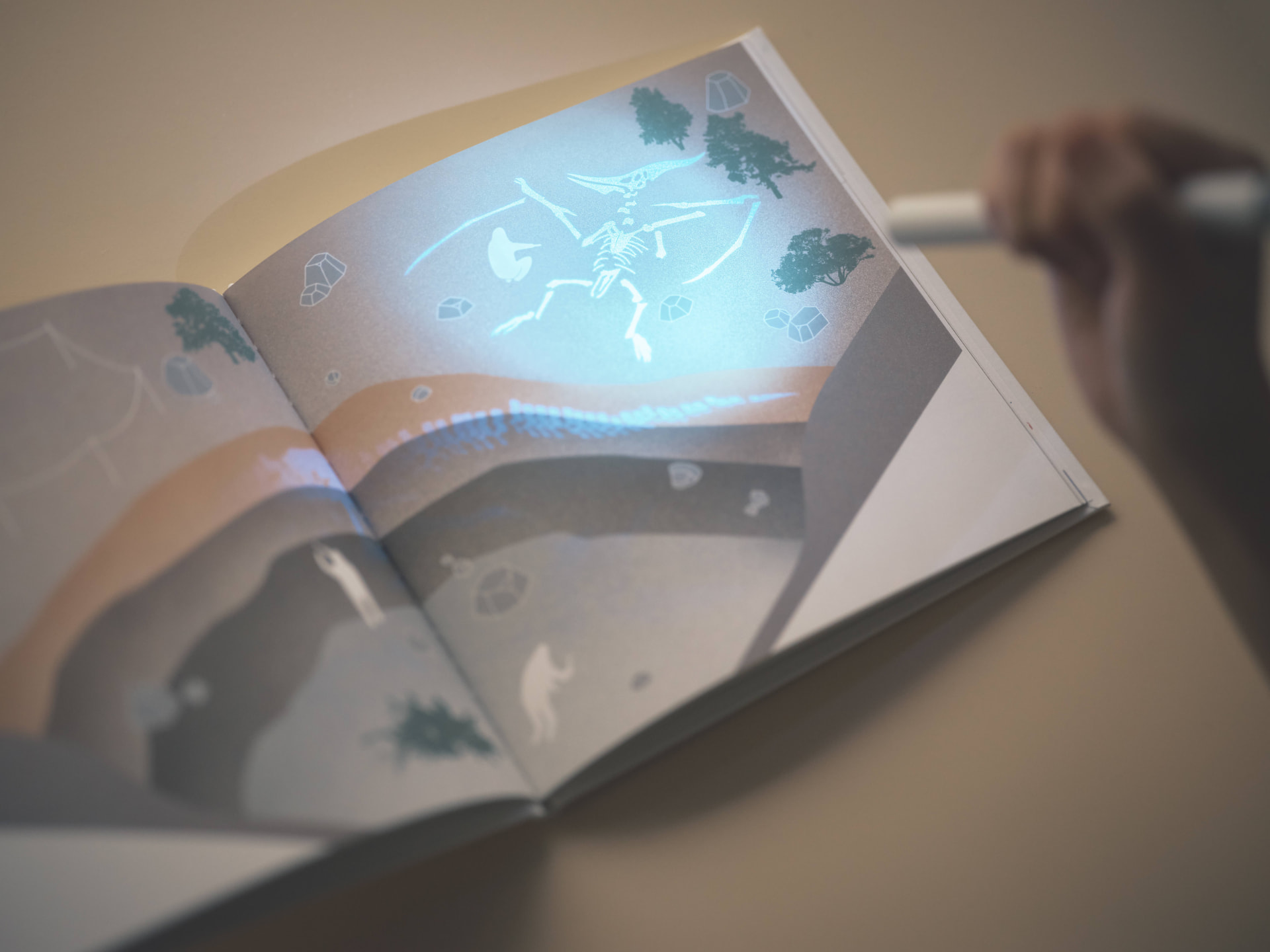 2020年度の東京ビジネスデザインアワード(TBDA)で優秀賞を受賞しました。ブラックライト印刷を実施した恐竜のシールを部屋に貼り、子どもが見つけて遊びながら学ぶというもの。商品化には課題も多く、企業とデザイナーの「人と人をつなぐコミュニケーションを実現する」という強い想いで乗り越えました。