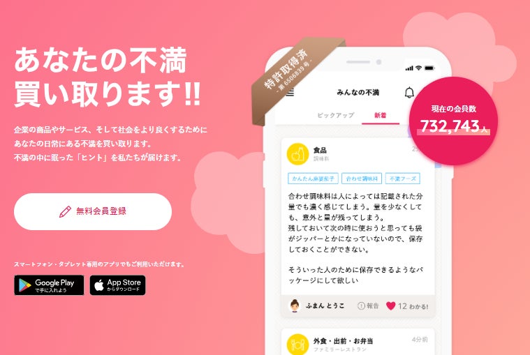不満買取センター(特許取得済み)は、「企業の商品やサービス、そして社会をより良くするために、あなたの不満を買い取ります。あなたの不満の中に眠った”ヒント”を私たちが企業や社会に届けます」をコンセプトに、2015年3月18日からサービス開始をしております。Webサービス及びスマートフォンアプリを通して生活者からの不満の声を収集しており、現在累計73万人以上の会員から、累計4,000万件以上の不満を買い取っています。